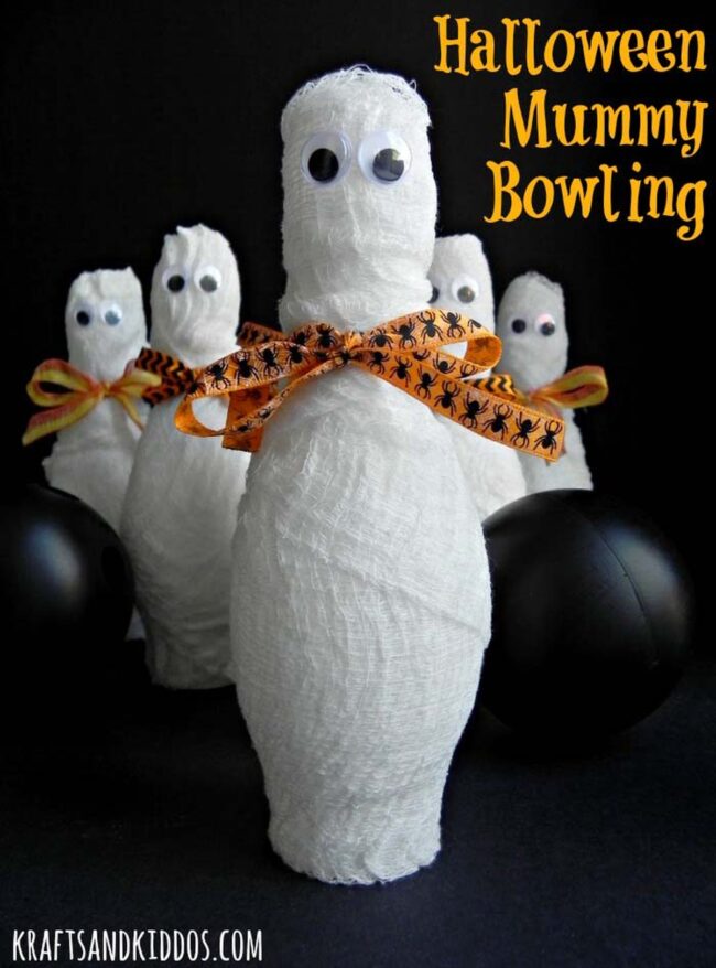 Halloween bowling brings spine-chilling excitement to family game nights with mummy-themed pins and eerie black balls.