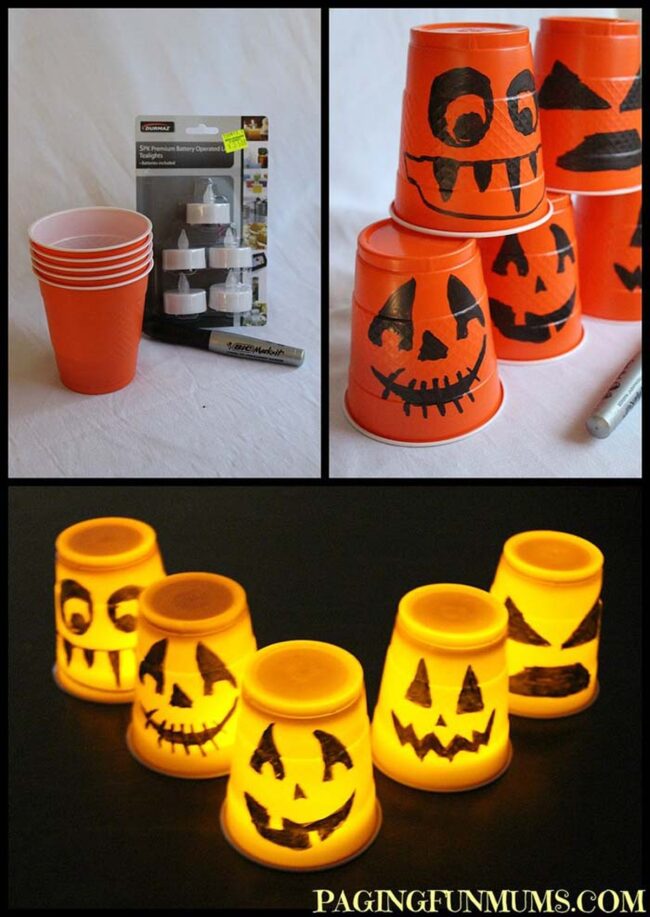 Crafting these luminous decorations requires minimal supplies like orange plastic cups, markers, and battery-operated tea lights.