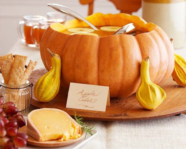 Hollowing out the pumpkin carefully preserves its beautiful exterior while creating a unique vessel for apple cider at seasonal parties.