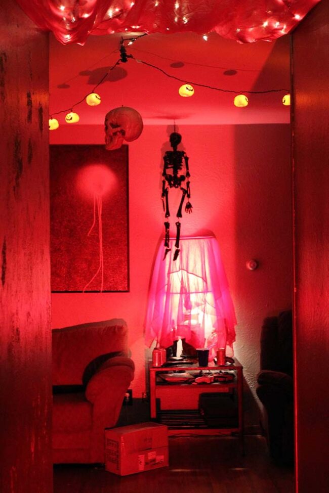 Red fabric draped strategically over lampshades creates an unsettling crimson glow throughout the room, transforming ordinary spaces into haunting landscapes.