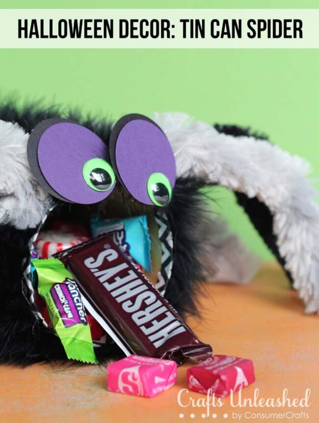 Quick crafters can easily wrap tin cans with faux leather or textured paper, creating eight-legged monsters that double as festive decor and treat holders.