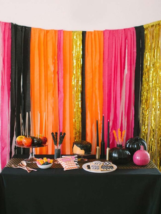 Halloween party decor reaches new heights with a dazzling color palette blending pink, gold, orange, and black that electrifies the entire event space.