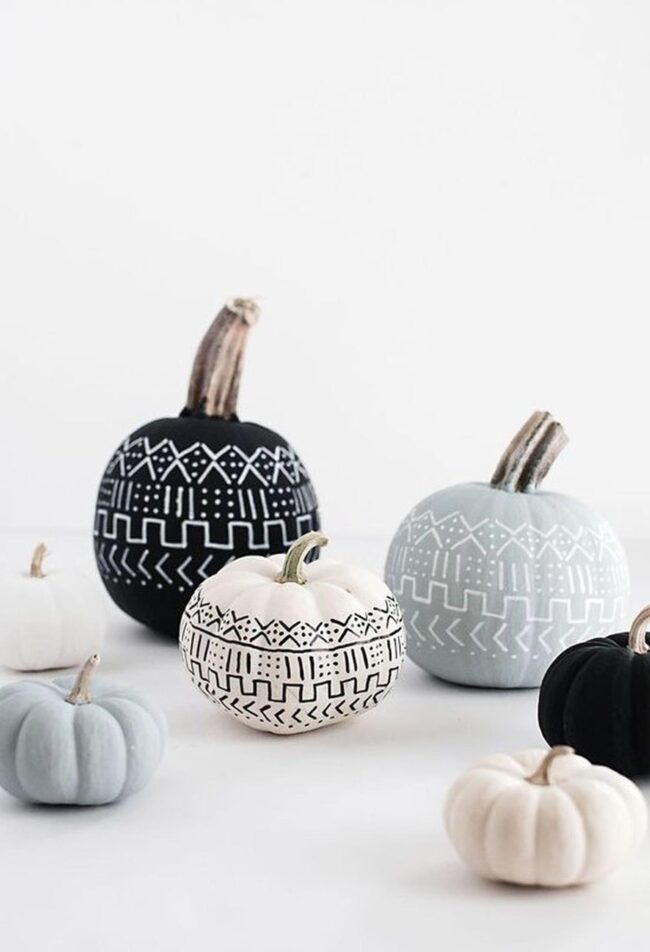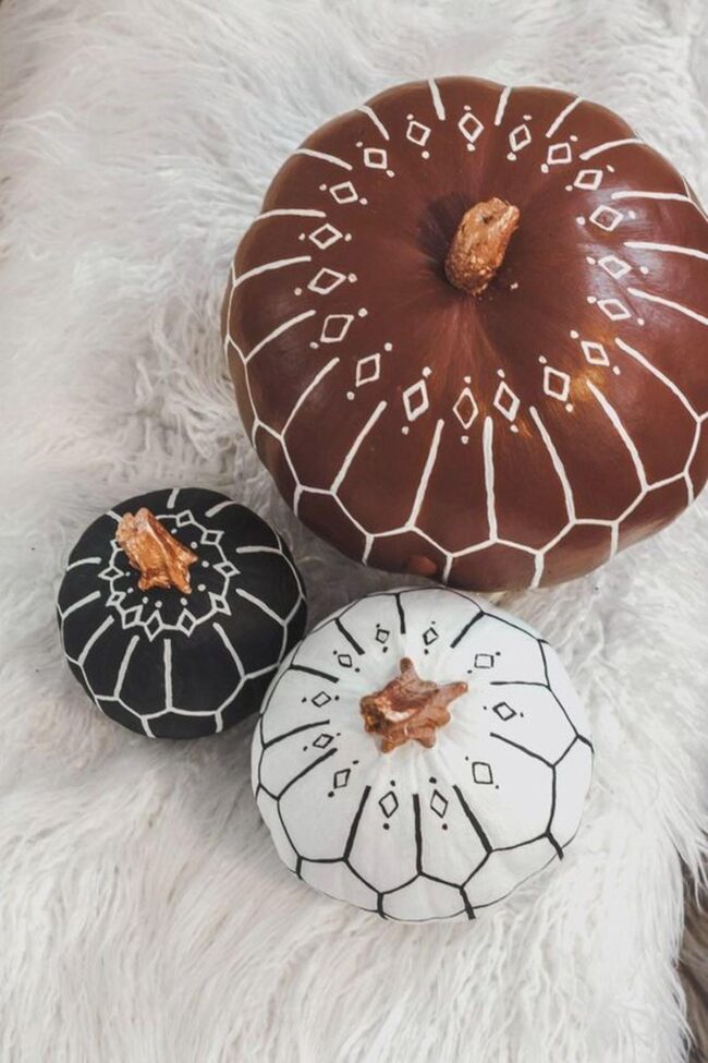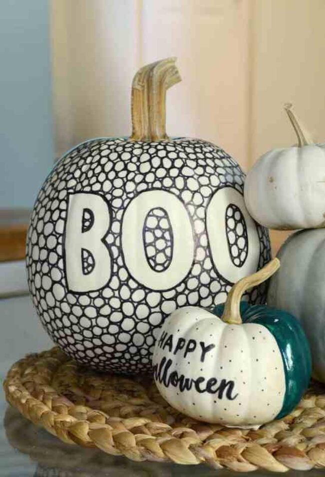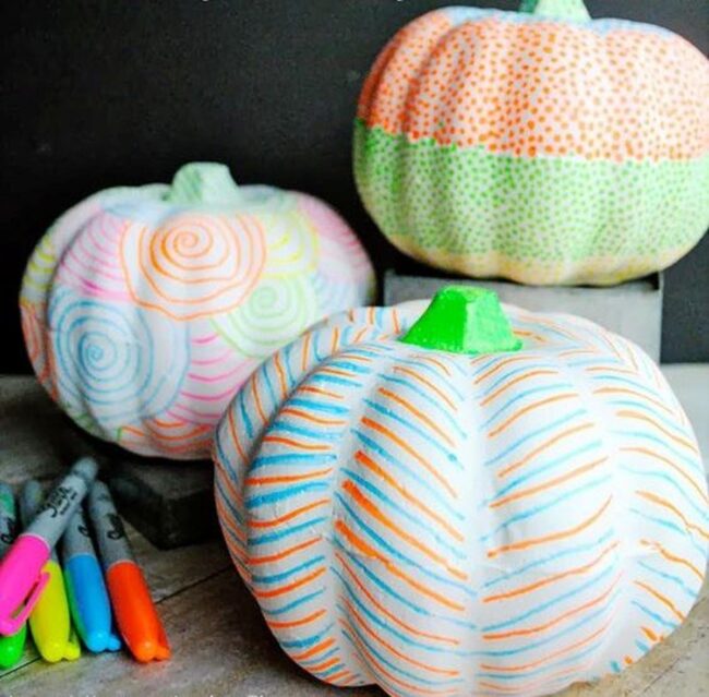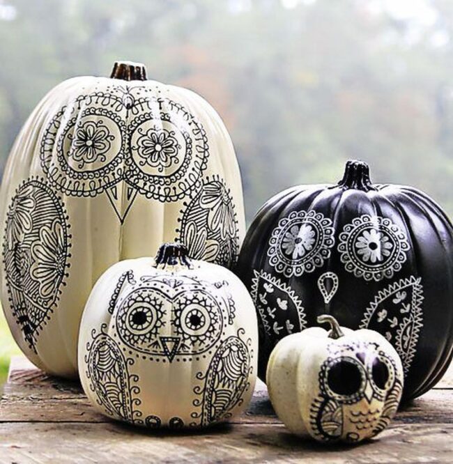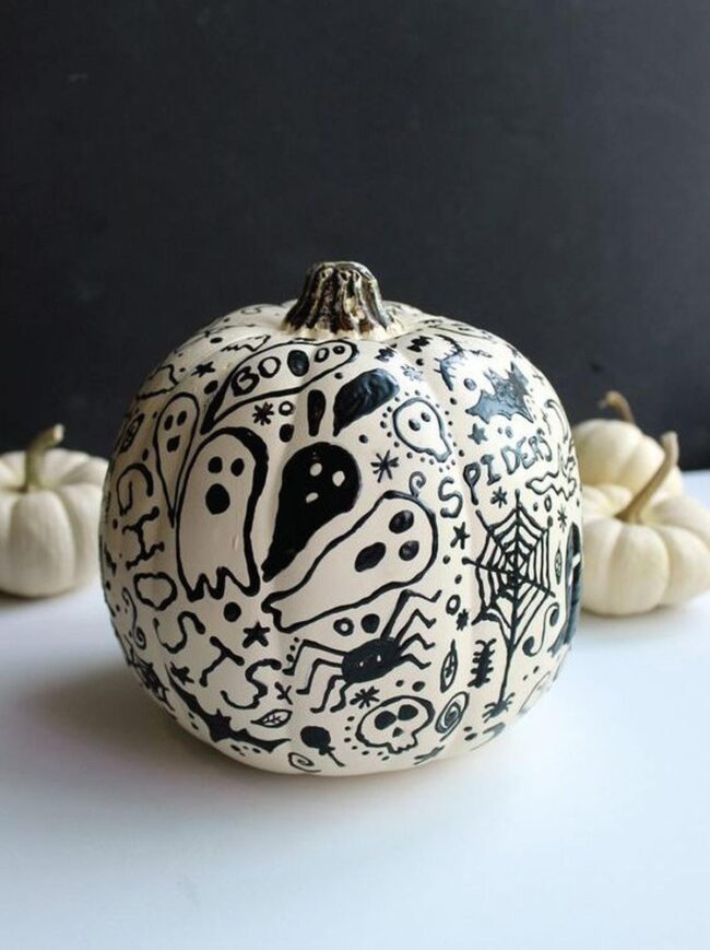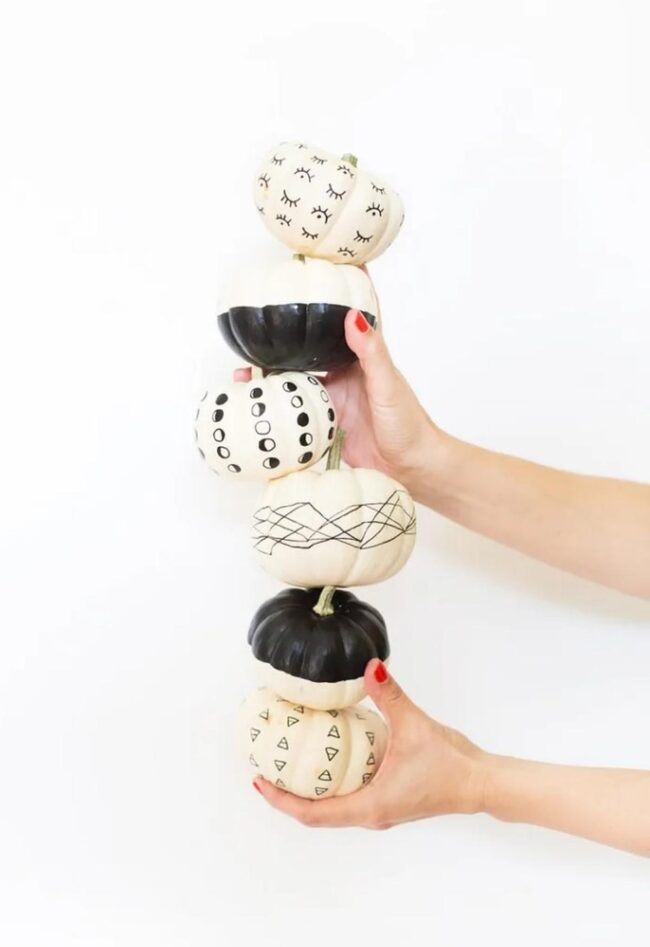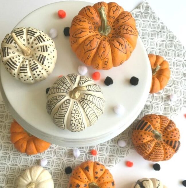 Pumpkins become stunning art pieces with just a few creative touches like black doodle patterns or unexpected color combinations.