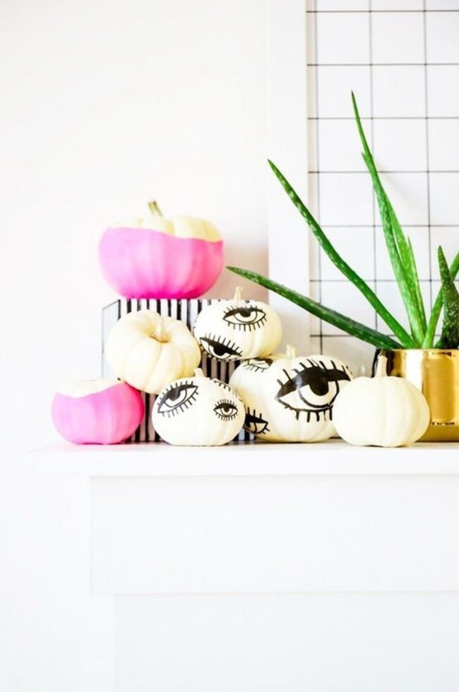 Mixing unconventional elements like white shelves, quirky pumpkins with expressive black eyes, and golden plant pots creates an instant conversation starter that feels both playful and sophisticated.