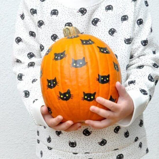 Halloween magic bursts from pumpkins adorned with whimsical black cat faces, their piercing yellow eyes creating a spellbinding scene that instantly draws you in.