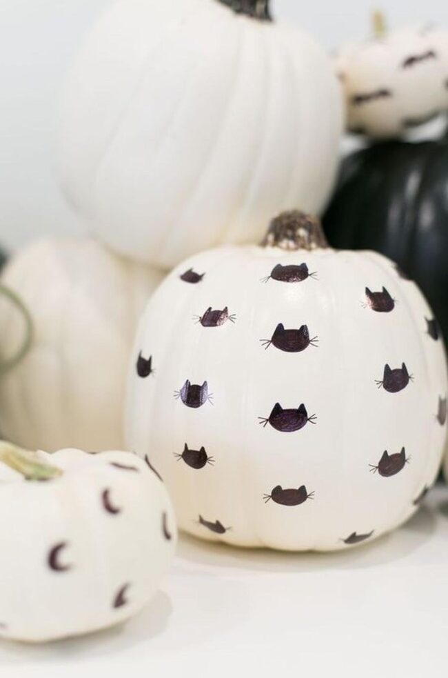 Halloween decor gets a chic upgrade with white pumpkins sporting adorable black cat faces that steal your attention instantly.