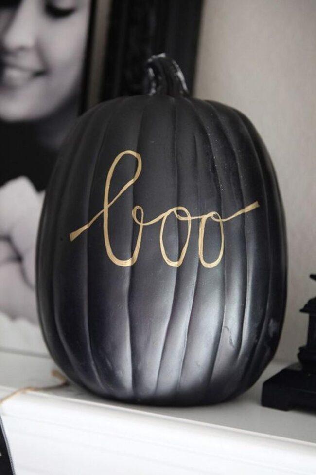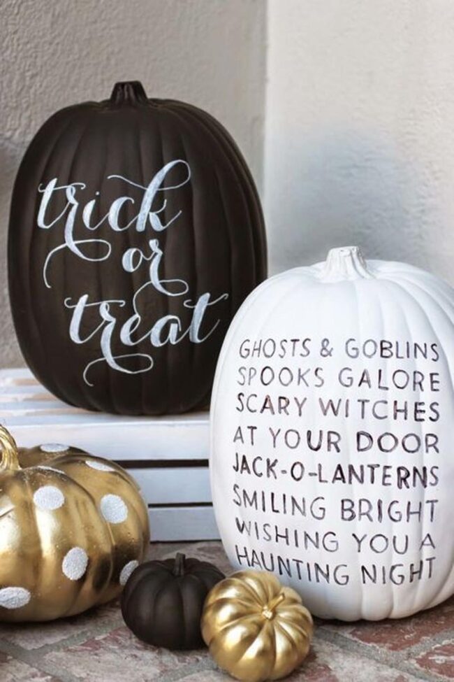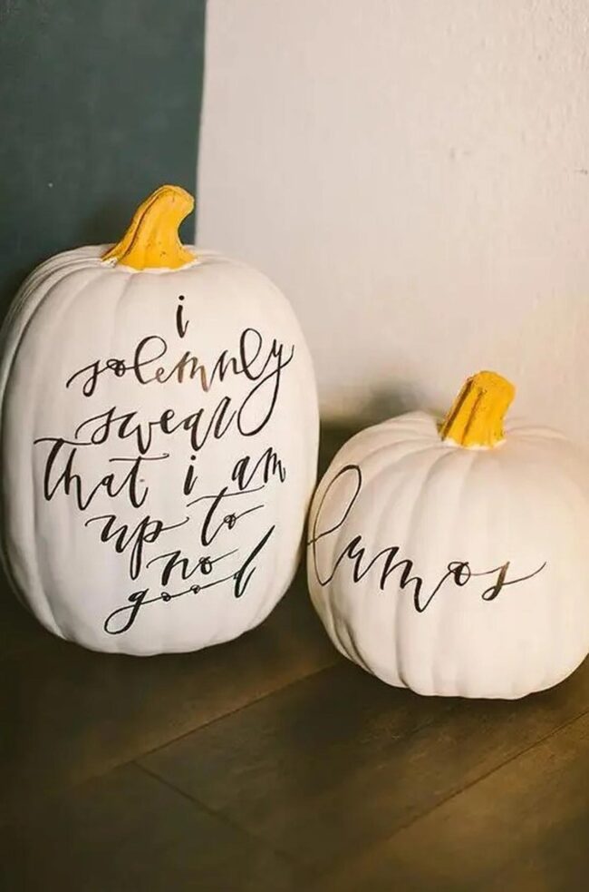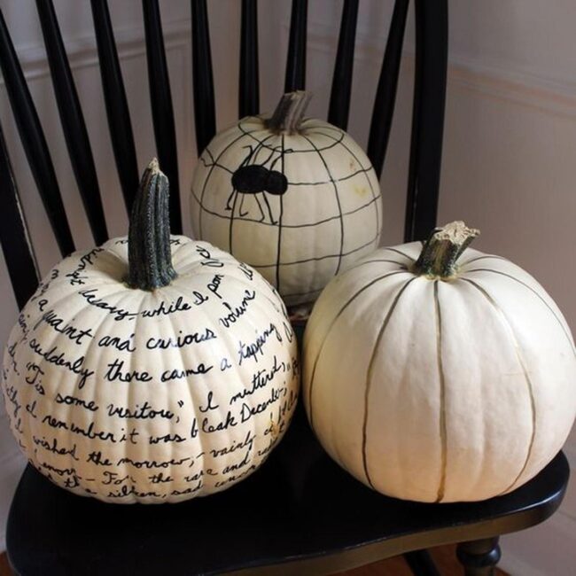 One pumpkin scribbled with delicate black writing creates an artistic statement that feels personal and intriguing.