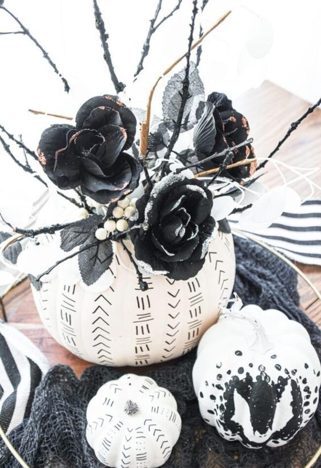 Black pumpkins become stunning conversation starters when adorned with intricate white floral designs that dance across their surfaces.
