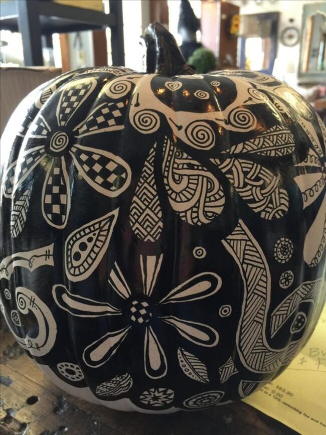 Fall decorations reach new heights with hand-painted pumpkins sporting intricate black floral designs on crisp white backgrounds.