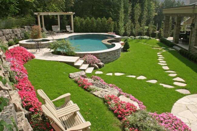 Colorful blooms strategically positioned around pool edges create an inviting atmosphere that beckons relaxation and enjoyment.