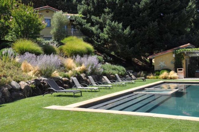 Flowering plants interspersed between sage provide bursts of color and texture, transforming ordinary pool areas into elegant outdoor retreats.