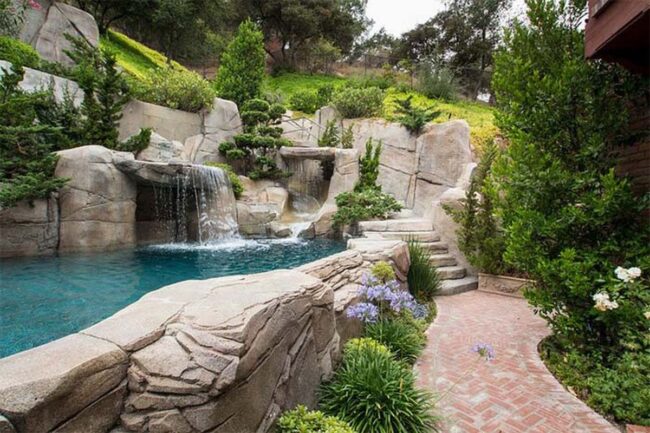 Cascading waterfalls integrated with stone elements add mesmerizing movement and auditory pleasure to the landscape.