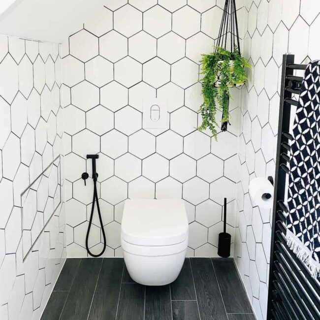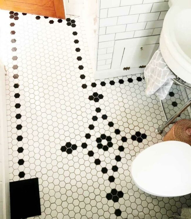 Black and white hexagonal tiles dominate the bathroom's design, creating a dramatic visual impact that instantly draws attention.