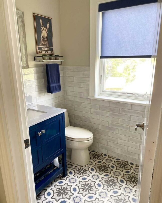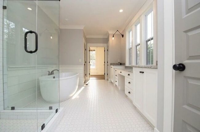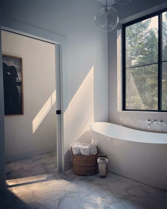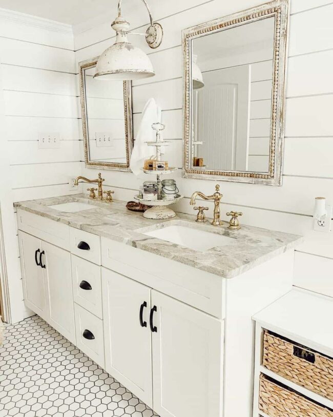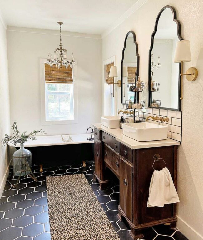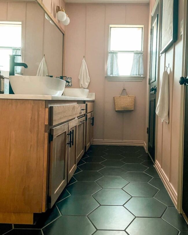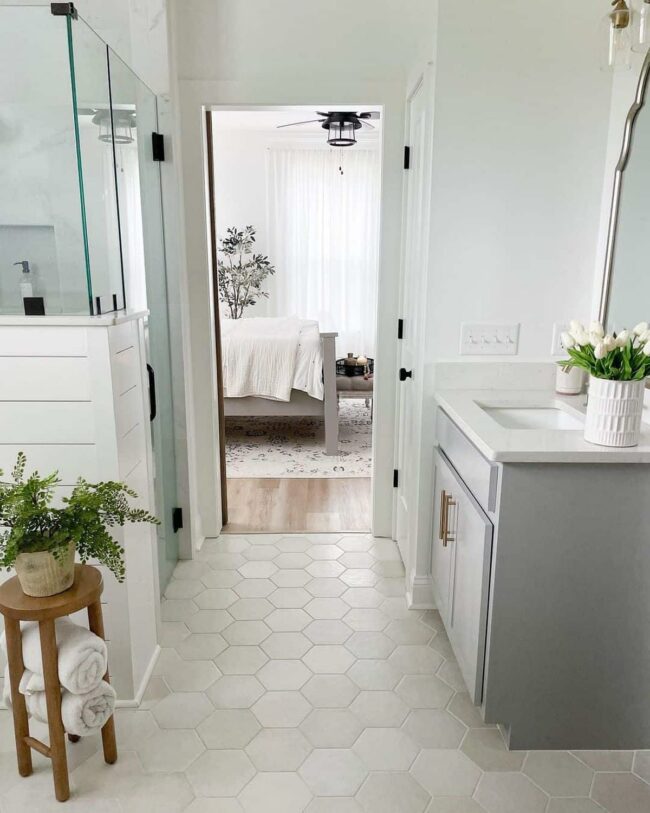 Hexagon tiles elevate bathroom design with their captivating geometric charm, making a bold statement in farmhouse-inspired spaces.