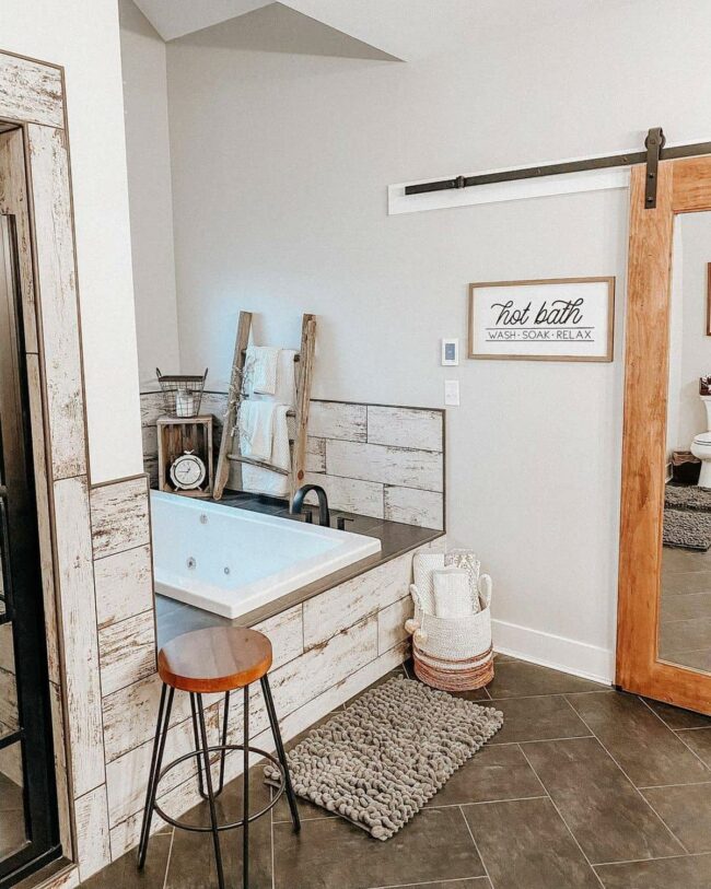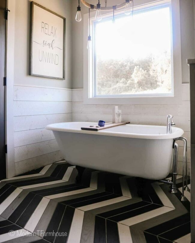 Distressed shiplap and vintage fixtures complement the distinctive tile pattern, adding depth and character to the space.