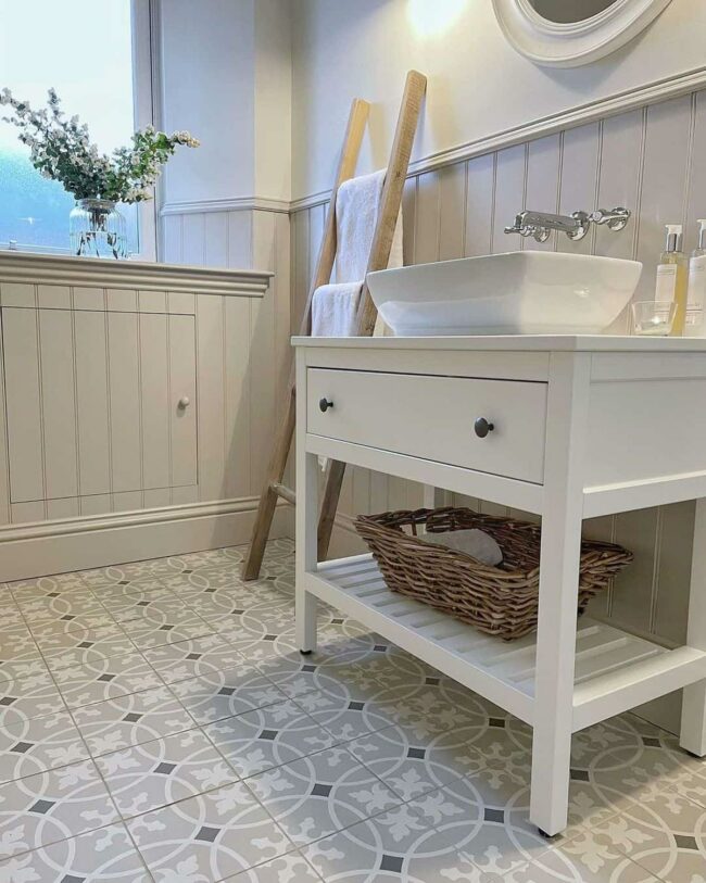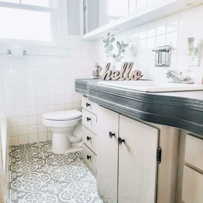 Half-moon tile stencils bring magic to bathroom floors, adding instant character with minimal effort.