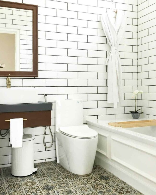 Dark grout alongside white tiles creates bold geometric patterns that catch every glance.