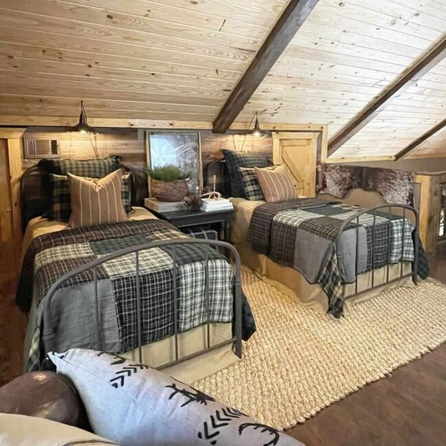 Rustic charm dominates this bedroom with two black metal beds nestled beneath dark wooden beams and weathered boards.