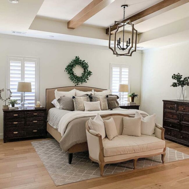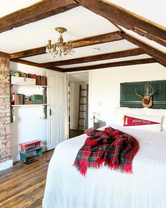Rustic bedroom magic unfolds with an exposed wooden beam ceiling that immediately captures attention.
