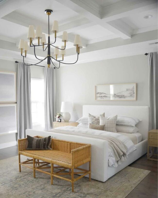 A wooden bench positioned at the bed's foot anchors the design with understated elegance.