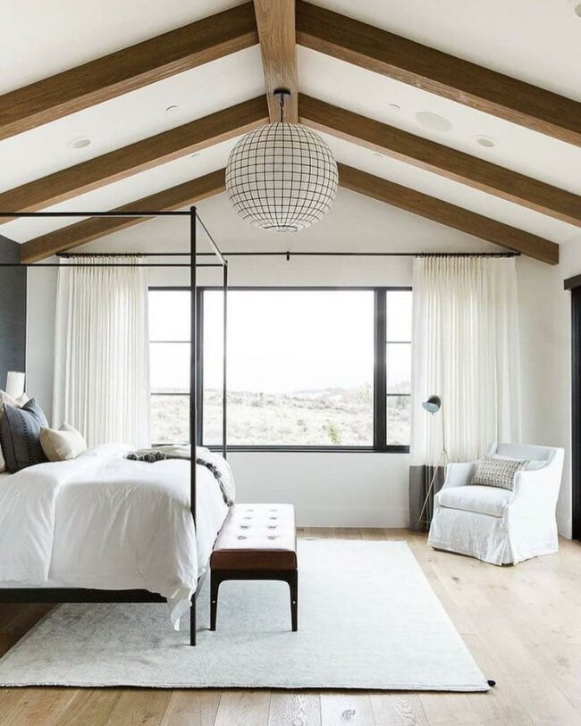 Dark wood beams contrast dramatically against the white ceiling, adding visual depth and character.