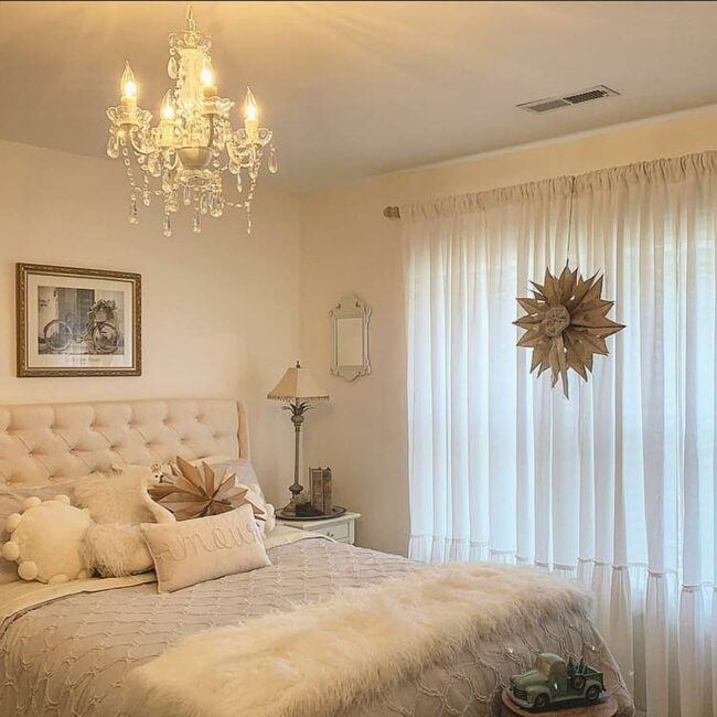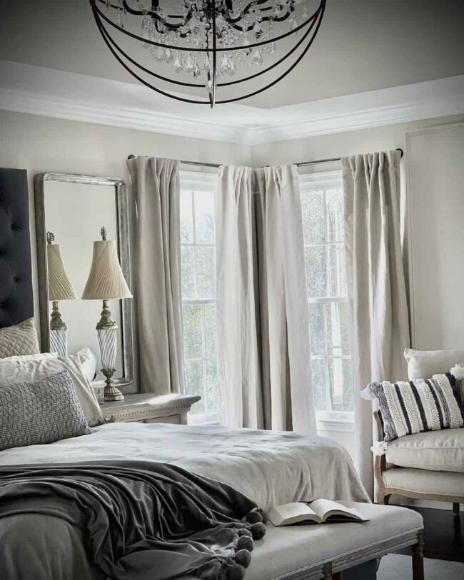 Magic chandelier cascades golden light across this dreamy bedroom, casting a warm spell over crisp white and gray bedding.