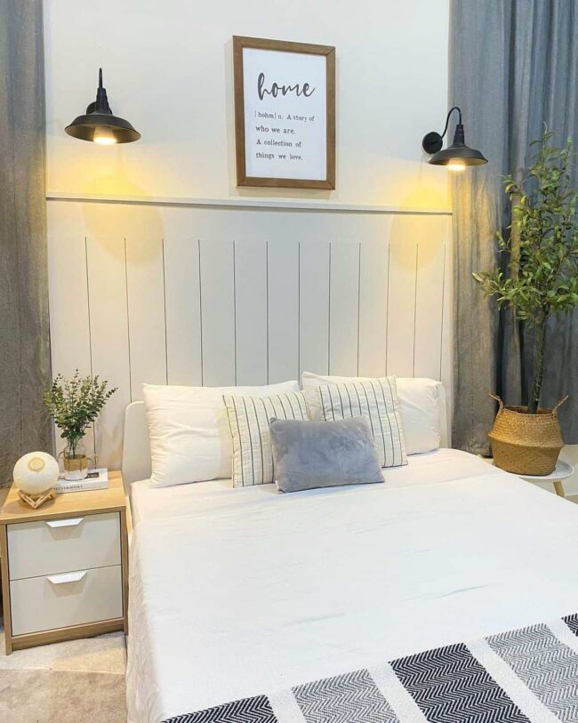 Delicate foggy lamp covers cast a gentle glow, transforming the bedroom into a serene sanctuary.