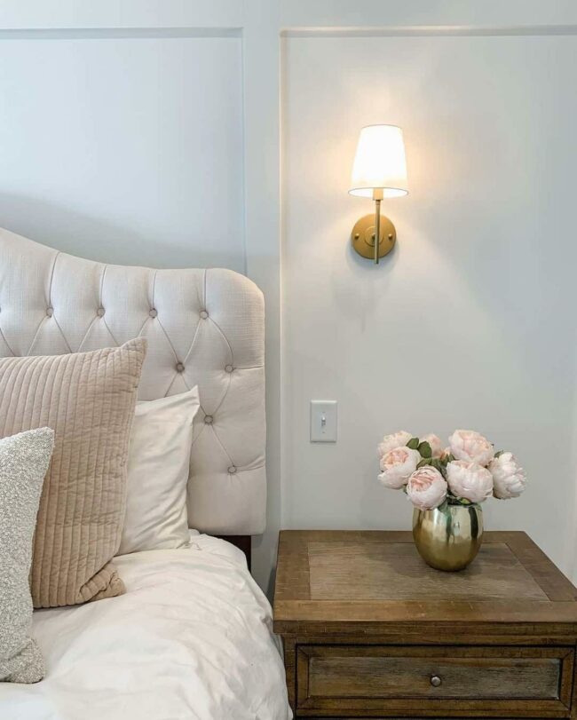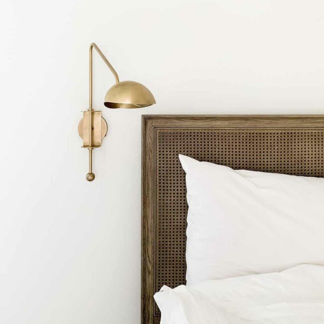 Gold sconces elevate bedroom design by freeing precious nightstand space from bulky lamps and tangled cords.