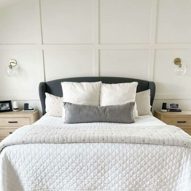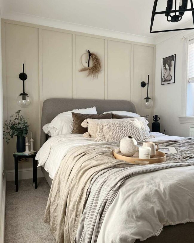 Modern bedroom design radiates calm and sophistication through carefully curated details like brushed nickel sconces framing a stylish bed dressed in neutral gray, white, and tan tones.