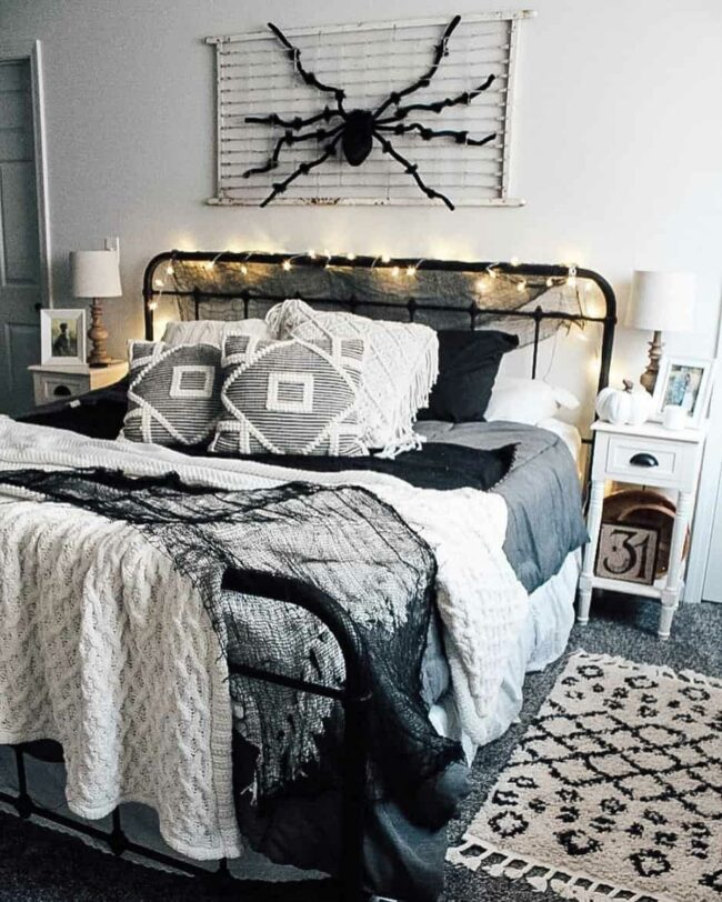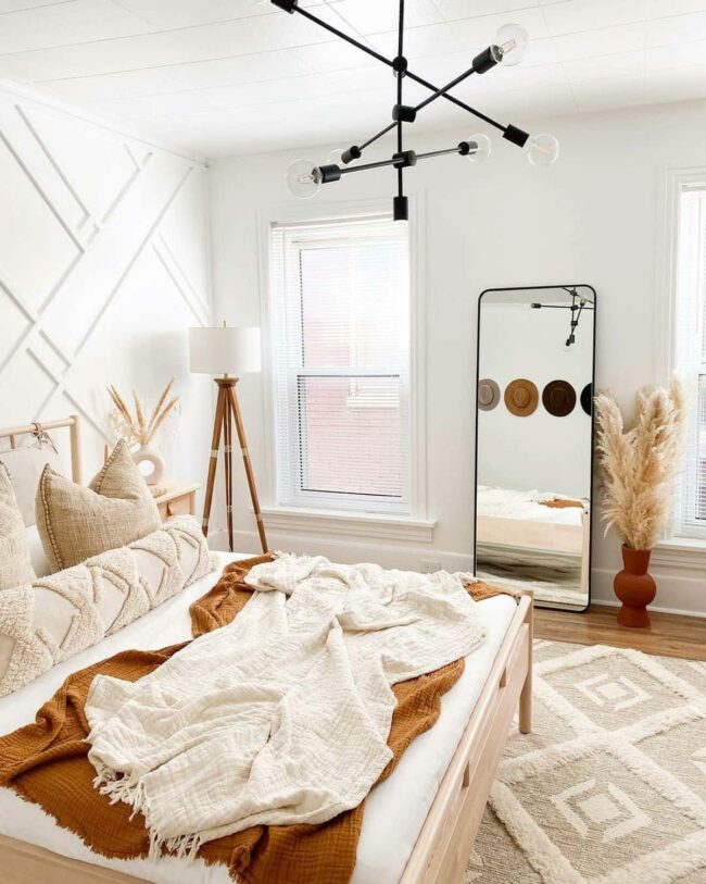 Black chandeliers with exposed bulbs capture immediate attention in this boho bedroom design.