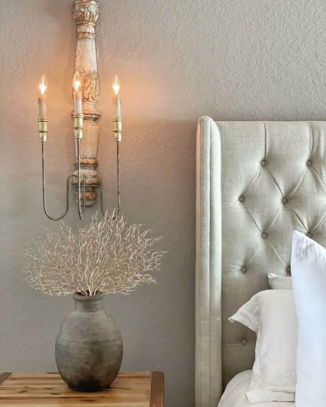 Gold sconces sparkle with vintage charm beside a luxurious beige headboard, casting elegant shadows across the space.