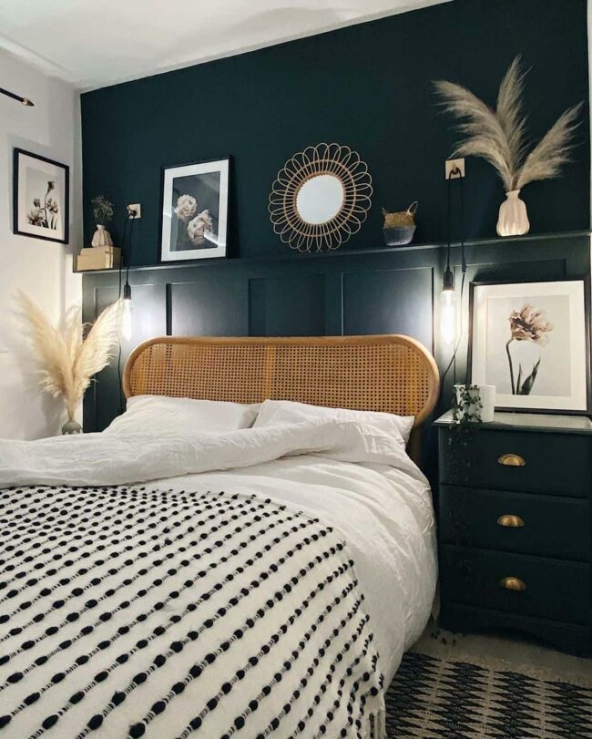 Matte black bedside lights with dangling glass orbs make a bold statement against beige board and batten walls, creating instant visual drama.