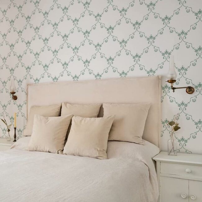 Green stencil wallpaper instantly elevates the room with its farmhouse charm, complementing the cream upholstered bedframe beautifully.