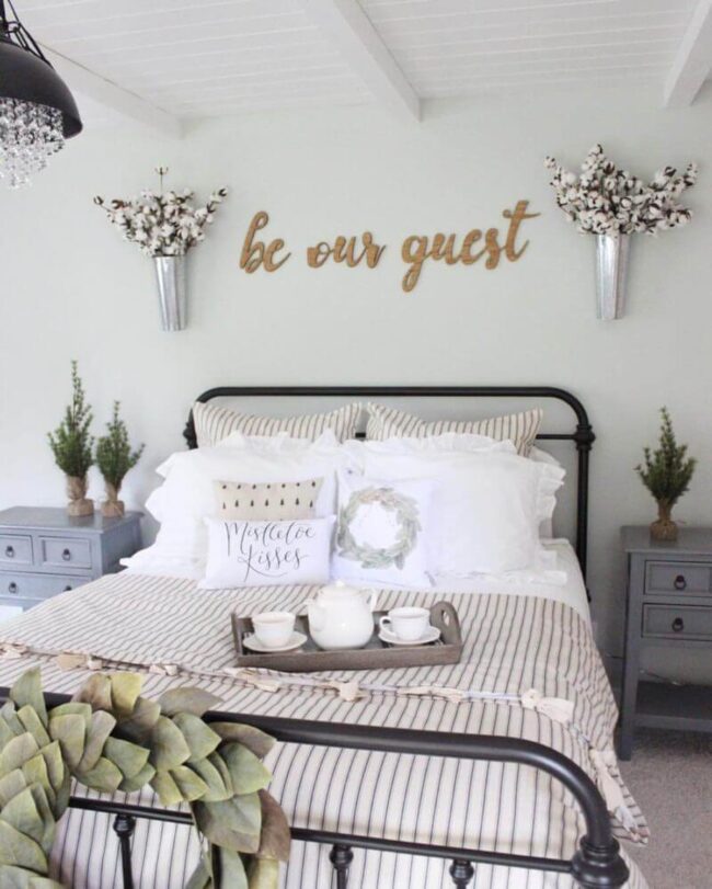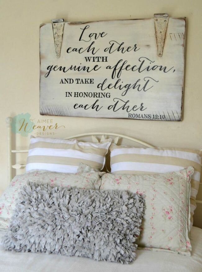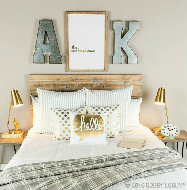 Rustic wooden signs inject personality into bedrooms, breaking symmetry with their raw, unpolished charm.