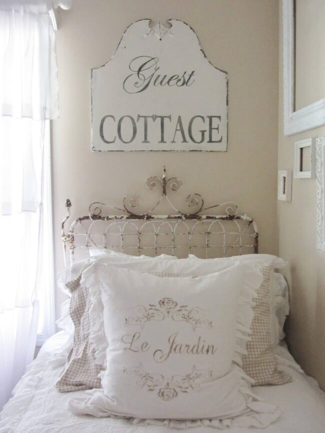 Metal signs with French-inspired charm elevate home decor, especially this guest cottage piece that blends elegant script with readable typography.