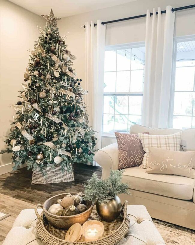 Rich gold, black, and white ribbons drape dramatically across the massive Christmas tree, instantly capturing everyone's gaze in the living room.