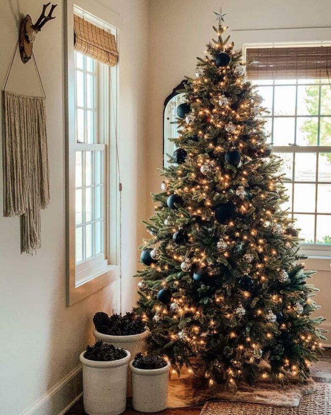 Black ornaments sparkle against pine branches, creating elegant contrast throughout the room.