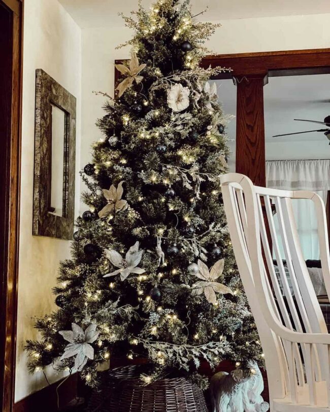 A radiant white Christmas tree stands proudly, adorned with shimmering black ornaments that dance against its snowy branches.
