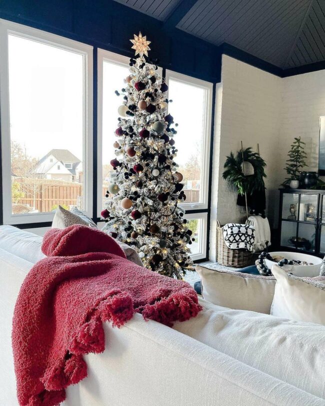Nestled in one corner, a black-adorned Christmas tree brings festive charm without overwhelming the sophisticated design.