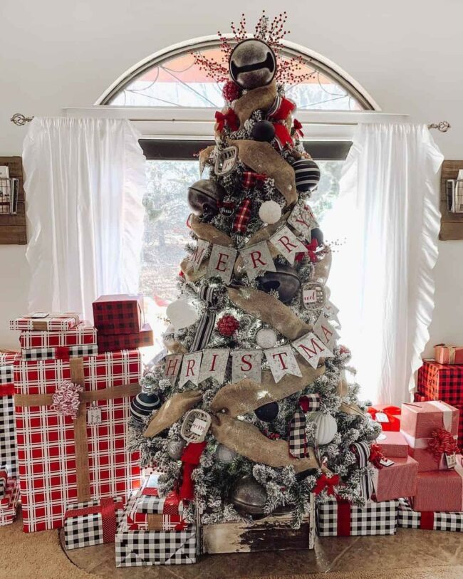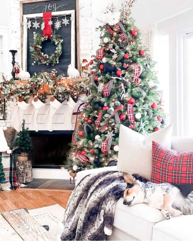 Bold red and black ribbons cascade across a Christmas tree standing proudly in the corner, creating a striking visual display of seasonal spirit.