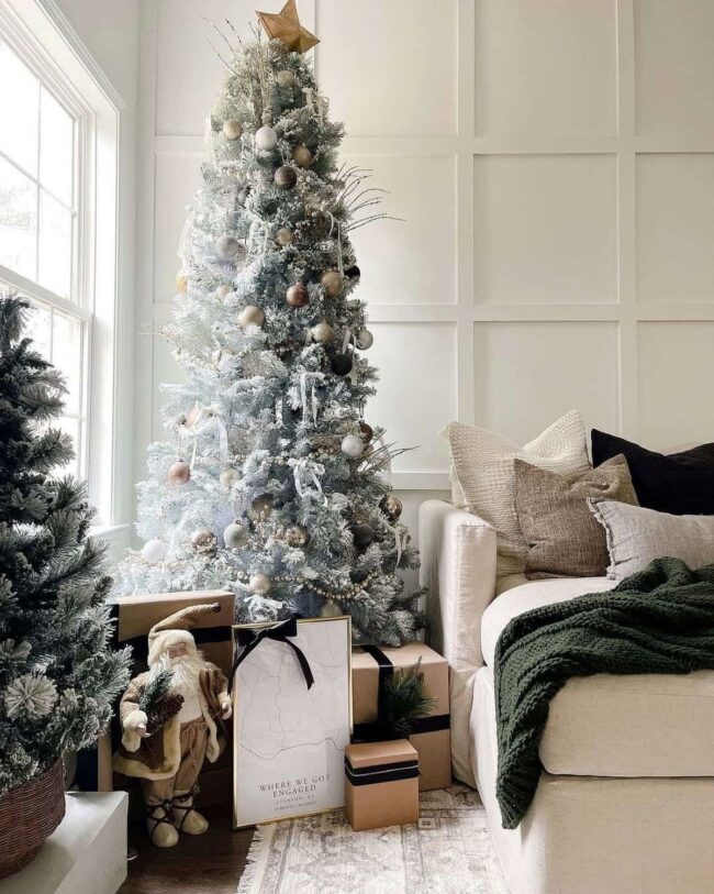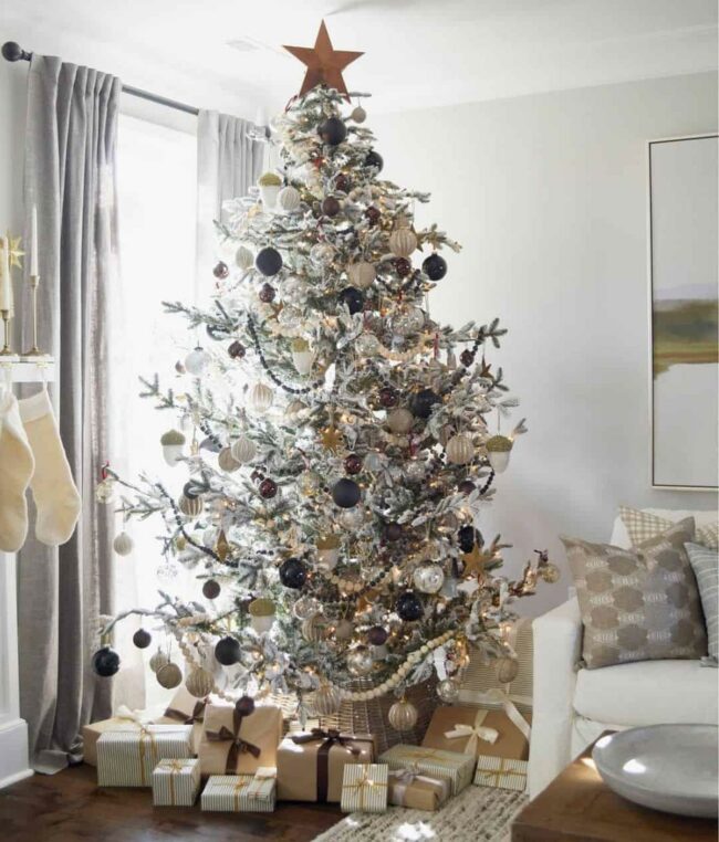 Perched atop the tree, a gleaming white star adds a magical touch to the scene.