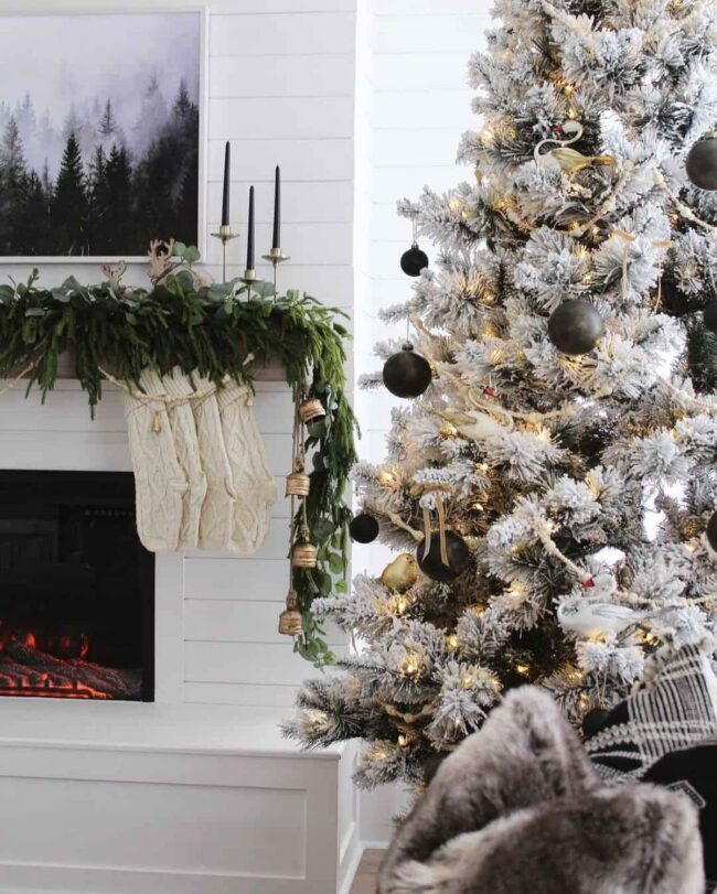 Sparkling black and gold ornaments adorn a frosted tree next to a shiplap fireplace, creating a magical holiday scene.