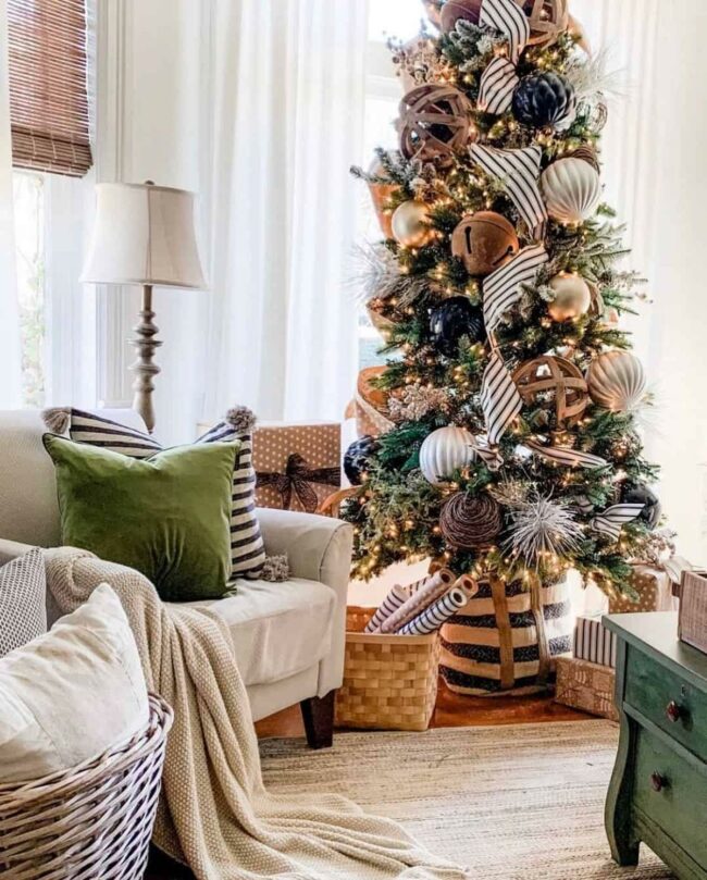 Sitting prominently in the corner, a Christmas tree dazzles with black and white ornaments carefully adorned with golden ribbons.
