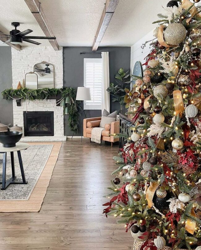 Christmas magic sparkles in this inviting living room, where a dazzling tree steals the spotlight with gold, silver, and red ornaments dancing against dark ribbons.