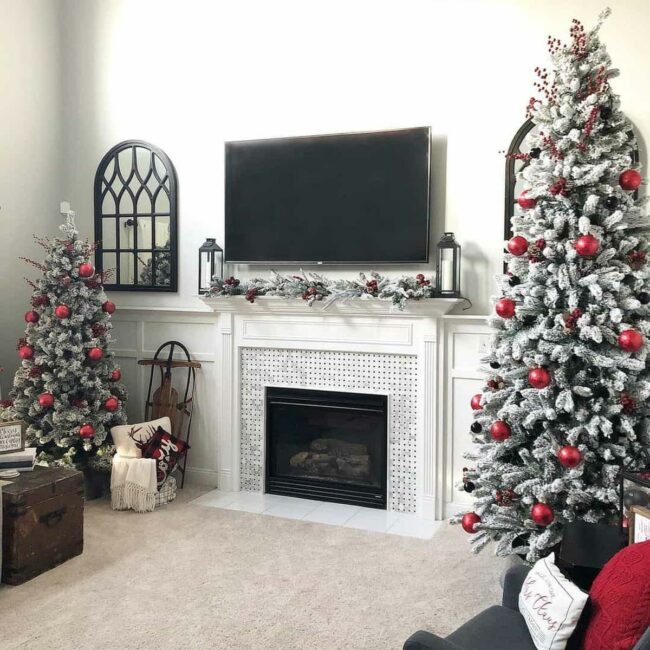 Vaulted ceilings elevate this holiday space with dramatic flair, drawing eyes to two illuminated Christmas trees flanking a warm gas fireplace.