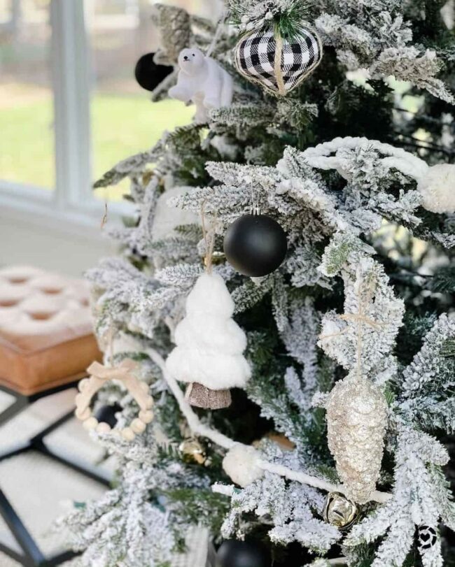Black and white buffalo plaid decorations steal the spotlight on a flocked Christmas tree that dominates this warm living room.