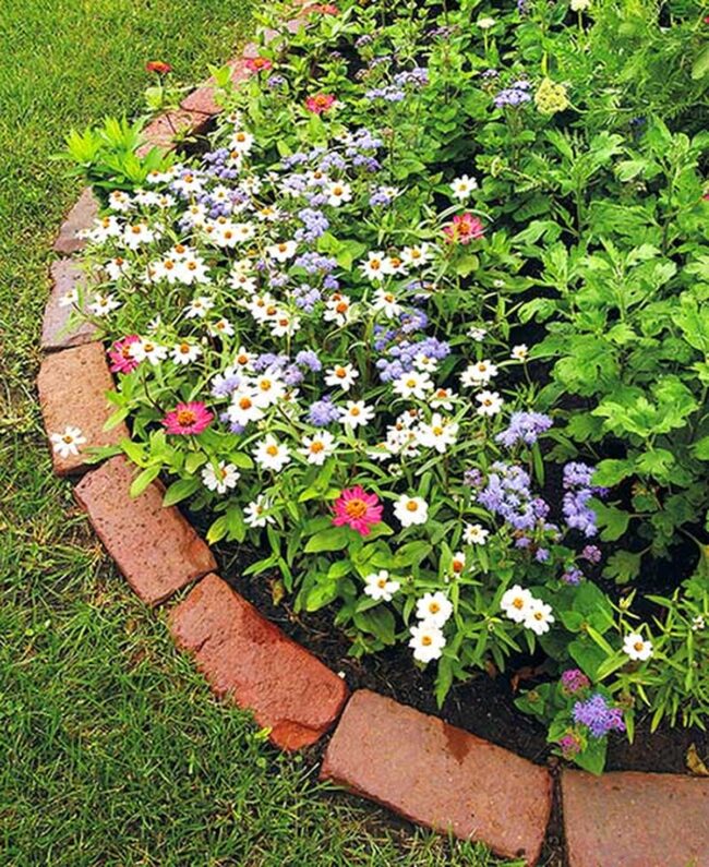 Mixing different brick sizes and colors adds visual interest and personalized character to garden edges.