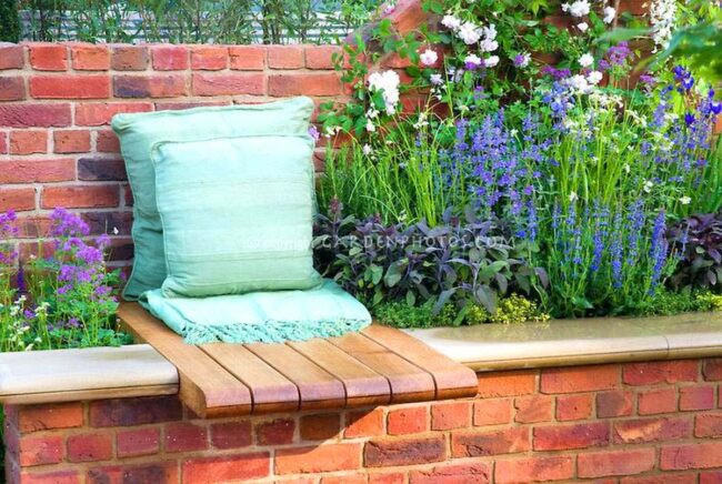 Wooden benches integrated into brick designs offer comfortable resting spots for enjoying outdoor environments.