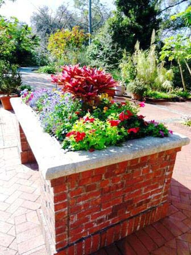 Succulents, herb gardens, and colorful flowering plants work beautifully within these brick-framed spaces.