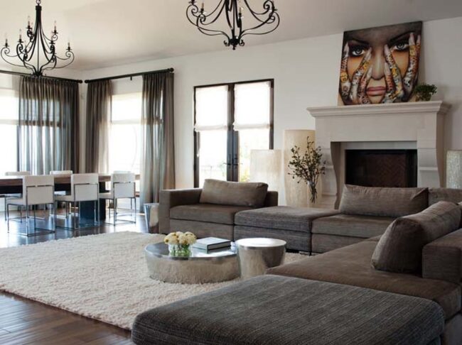 Neutral area rugs underneath create a grounding effect that ties furniture together seamlessly.